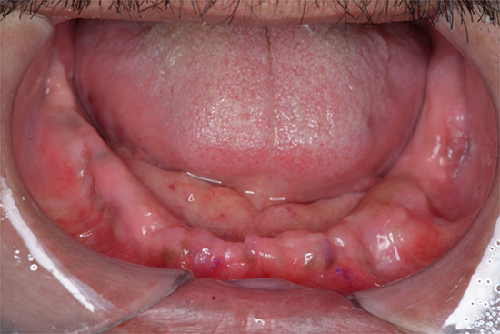 手術直前の口腔内、下顎の歯が全くない状況。